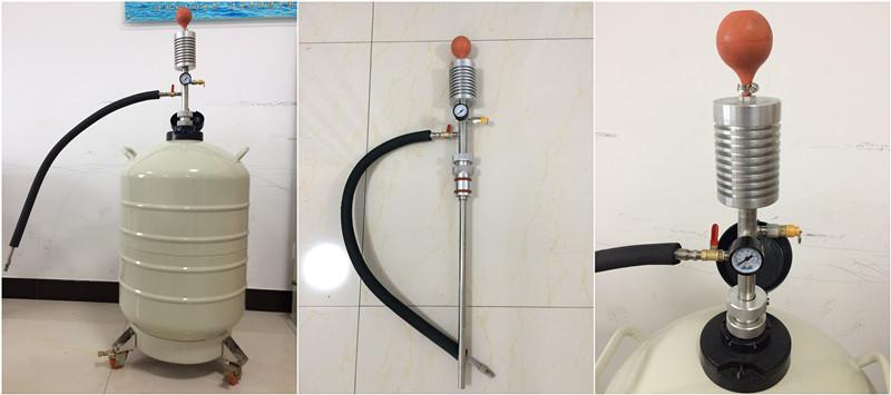該產品依靠操作者手捏吸液球(YDB-5型)或者腳踏氣缸(YDB-8型),使液氮容器內貯存的液氮少量產生氣化。由于液氮的氣液體積比較大,氣化后的氮氣在密封的容器內對盛裝的液氮增壓,促使容器內盛裝的液氮排放出來,達到對其它容器補充液氮的目的。它具有操作方便可靠、排液過程中液氮的蒸發損失低的優點。